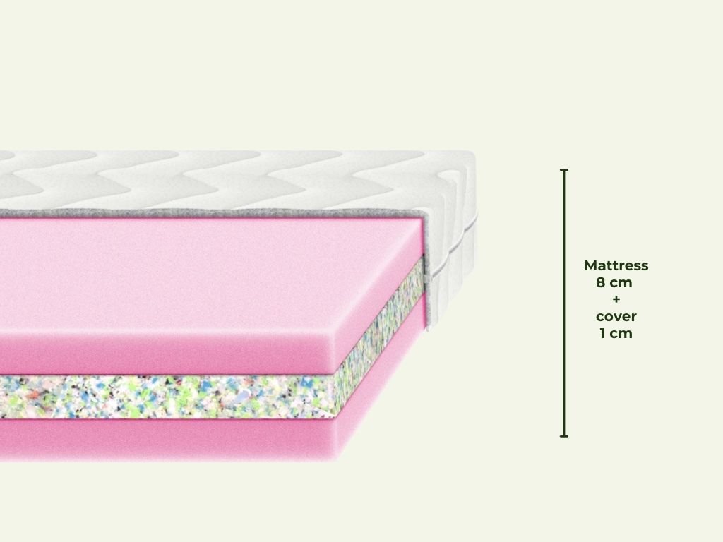 It is available in the size of 60 cm x 120 cm x 8 cm. The upper and bottom sides are made from a good-quality PUR foam which can properly support the whole body and retains its shape. In the middle, there is a solid board made from compressed foam mixture. As for connecting, a special natural Swiss water-based glue was used.