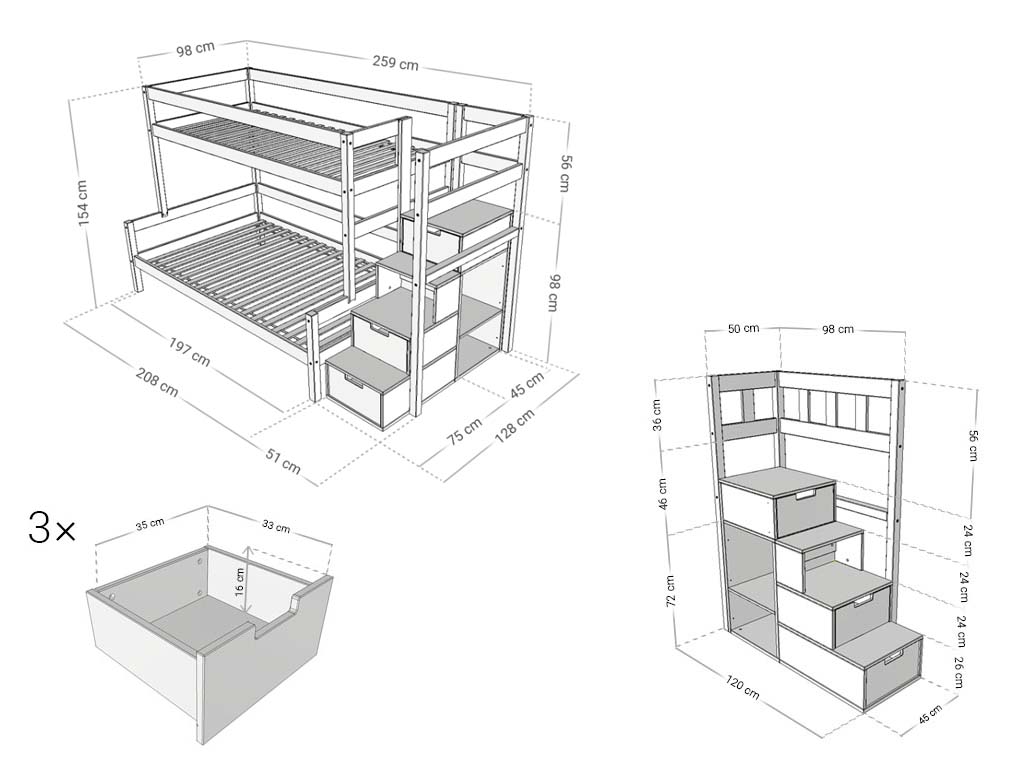 | Drawer load capacity: | extra bed 120 kg, storage drawer 20 kg, double storage drawer 2x20 kg |