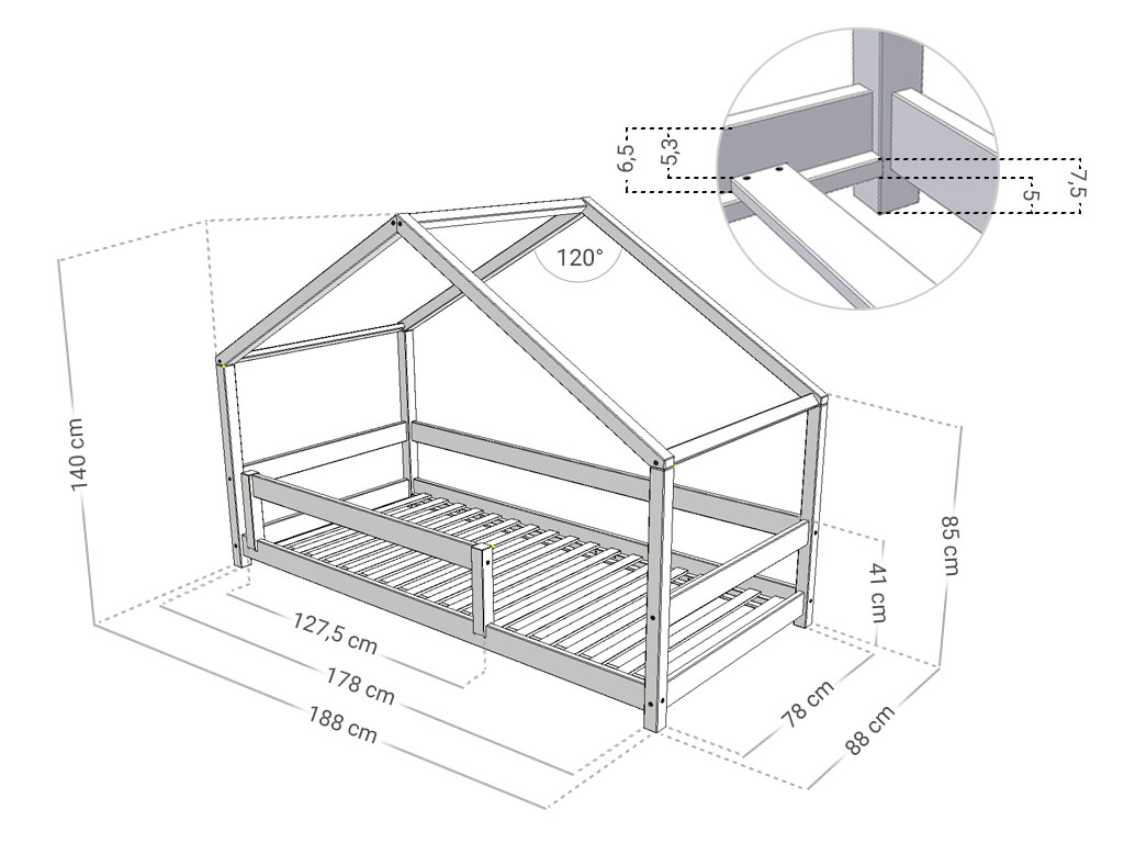 When do you, as a parent, sleep the best? It is certainly when you know that your child is safe. Equip your kid's room with a house bed including firm side rails which protect him or her every night. It is produced according to the Montessori philosophy so that every little dreamer felt safely in it and could create his or her own world. The bed is hand-made of 50 mm thick squared timber.