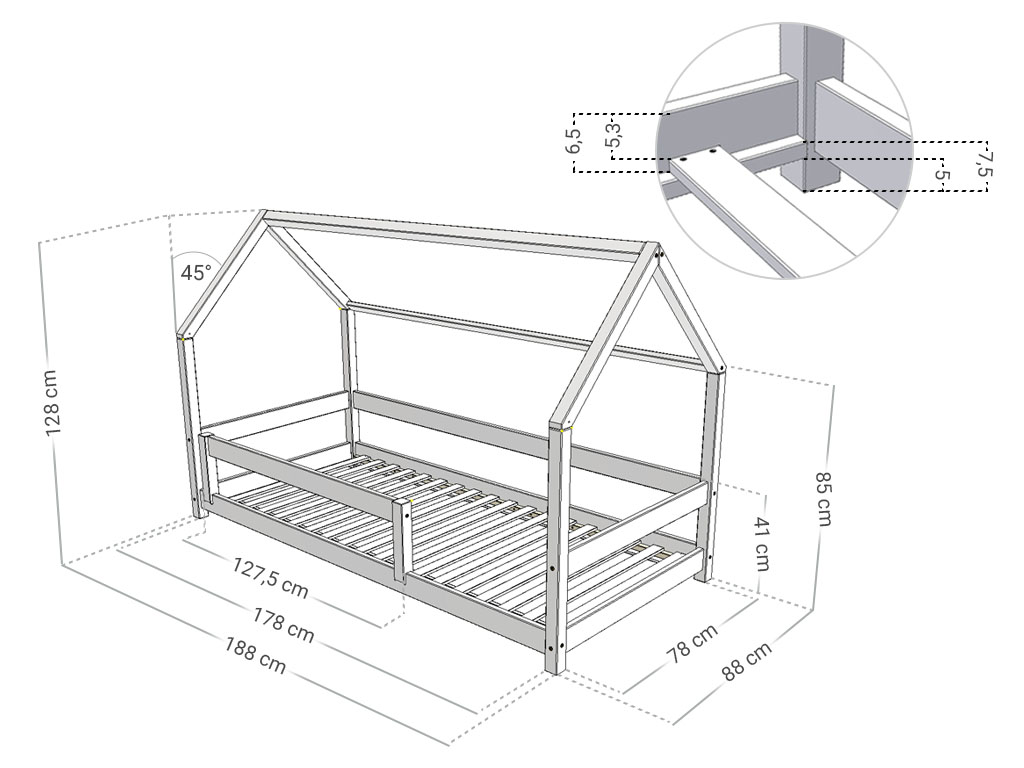 When do you, as a parent, sleep the best? It is certainly when you know that your child is safe. Equip your kid's room with a house bed including firm side rails which protect him or her every night. It is produced according to the Montessori philosophy so that every little dreamer felt safely in it and could create his or her own world. The bed is hand-made of 50 mm thick squared timber.