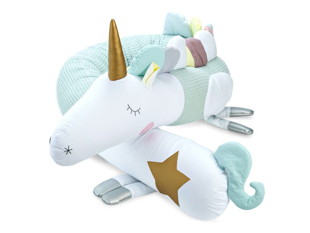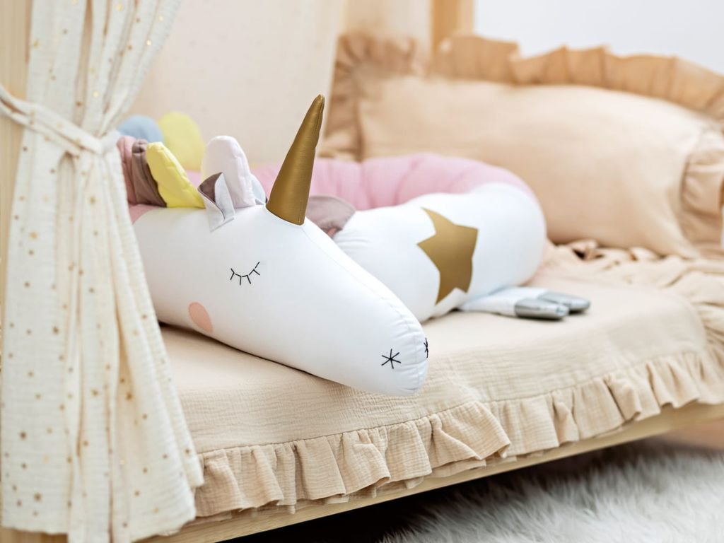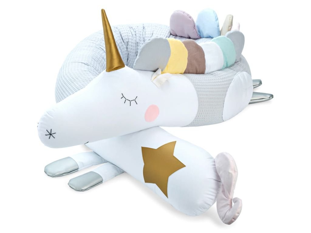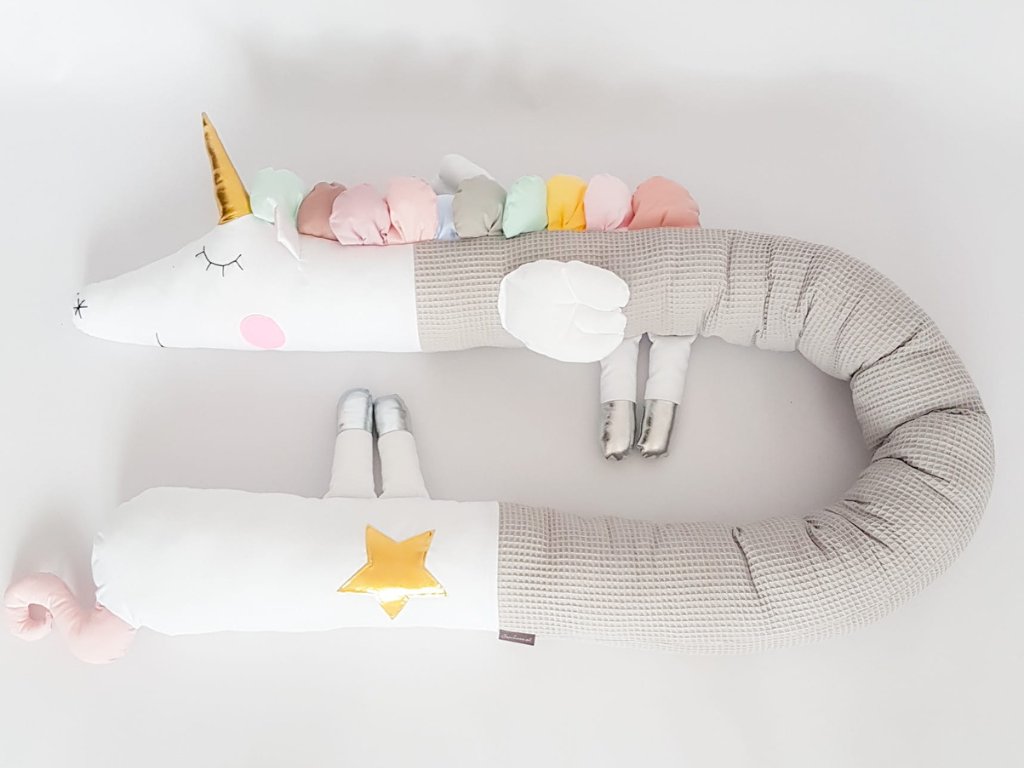 It is hand-sewn according to strict European standards. It meets OEKO-TEX Standard 100 and TÜV Rheinland, making it suitable for even the smallest children. It is made of 100% cotton and filled with siliconized fiber, which ensures suitability even for small allergy sufferers. The length of the unicorn is 230 cm and the height/width is 14-15 cm, making it long enough to fill all the risk areas of a child's bed.